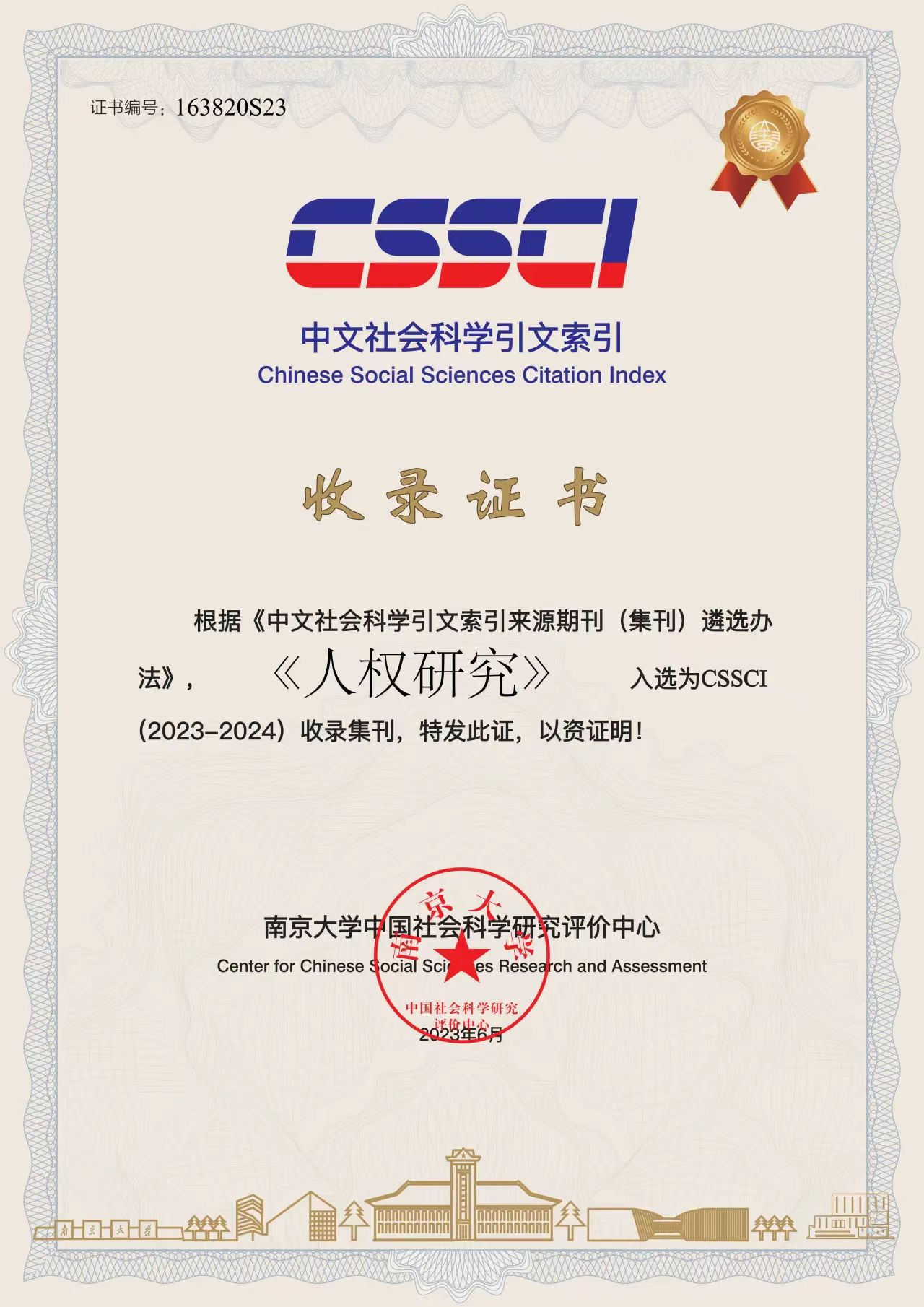 近日,南京大学中国社会科学研究评价中心发来消息,根据《中文社会科学引文索引来源期刊(集刊)遴选办法》,太阳集团tyc4633人权研究中心主办的学术集刊《人权研究》入选为CSSCI(2023-2024)收录集刊。