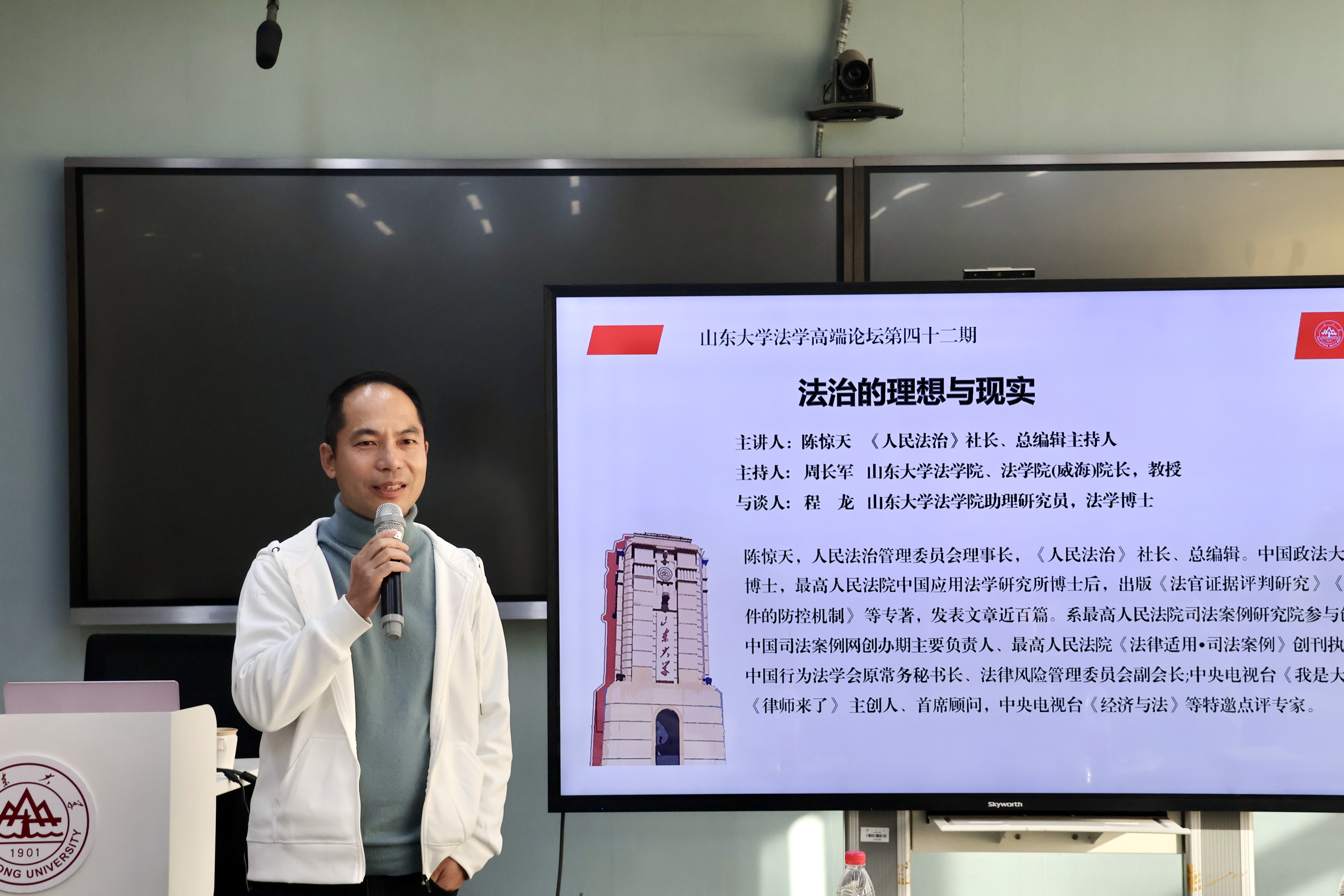 11月14日,太阳集团tyc4633法学高端论坛第四十二期于青岛校区华岗苑举办。《人民法治》社长、总编辑陈惊天以“法治的理想与现实”为题作学术报告。讲座由太阳集团tyc4633、太阳集团tyc4633(威海)院长周长军教授主持,太阳集团tyc4633程龙助理研究员担任与谈人。