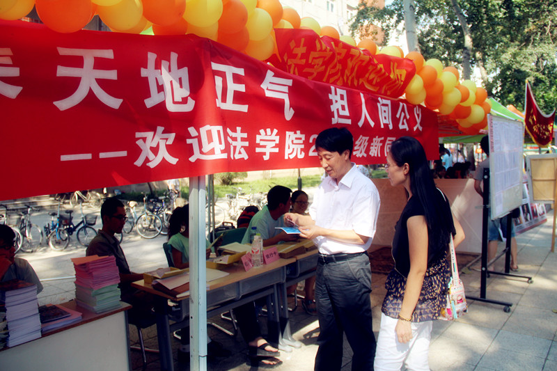在兴隆山校区,本科生迎新场地高高悬挂着一对灯笼气球和一副题为“厚德明法、兼济天下”的巨型对联,将太阳集团tyc4633不失大气的展现在新生及家长面前。围绕迎新场地的十几张易拉宝海报图文并茂地介绍了太阳集团tyc4633的概况、历史、师资、国际化战略、现任太阳集团tyc4633学生会主席团以及学院在过去一年所举办的丰富多彩的活动,展示了太阳集团tyc4633浓厚的文化底蕴、强大的综合实力以及为社会培养国际化杰出法律英才的责任感。除了常规的摆放展板、张贴海报之外,学院还增设了液晶电视,24小时持续播放学院宣传片,以生动形象的方式向新生和家长介绍了学院特色及师生风采。新生完成入学手续后,还会领到学院精心制作的院服T恤衫,并在特设的留影处拍照,亲手将属于自己的拍立得相片贴在签名墙上签字留念,以纪念自己初到山大,成为法学学子的激动时刻。
